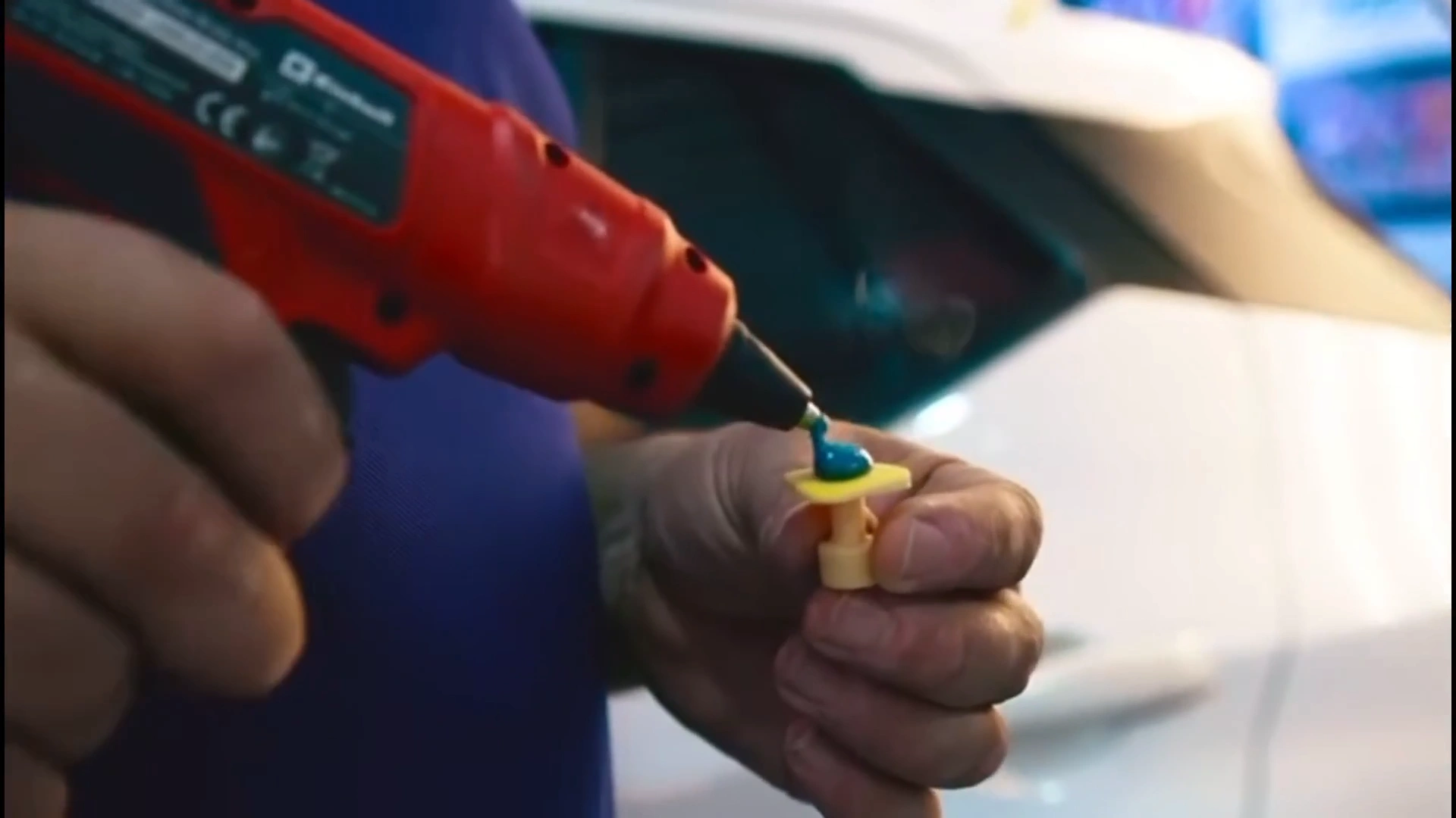 Use pouca cola, proporcional ao tamanho do amassado. Coloque sempre no centro da ventosa e no ponto mais fundo. A cola não deve sair pelas bordas, garantindo tração concentrada.
